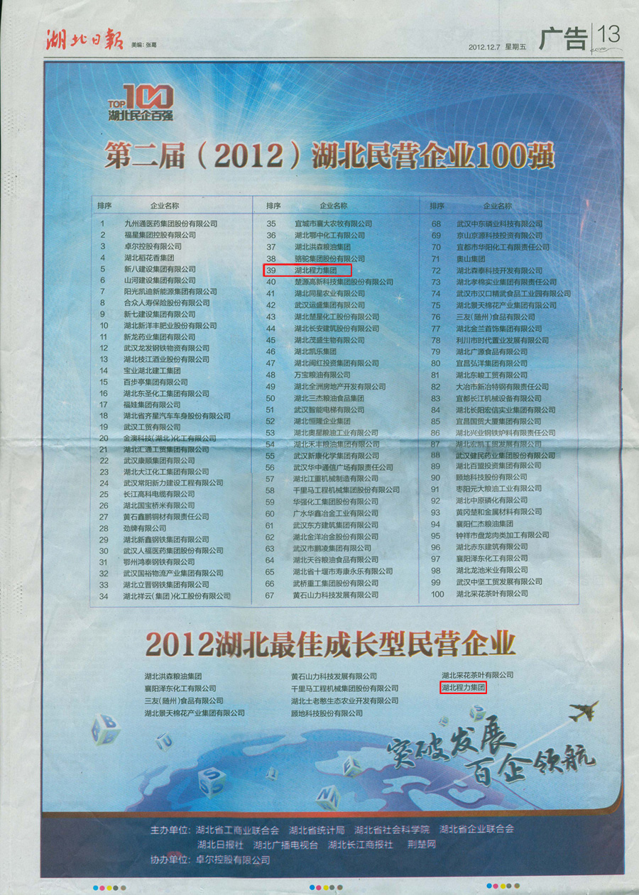 由湖北省工商业联合会、湖北省统计局、湖北省社会科学院等单位举办的第二届(2012)湖北民 营企业100强,昨天在湖北省民营企业100强出炉,湖北平博pinnacle体育平台集团榜上有名。